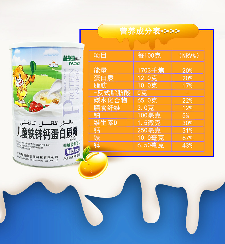 正品儿童钙铁锌蛋白质粉罐装1000克加送50g